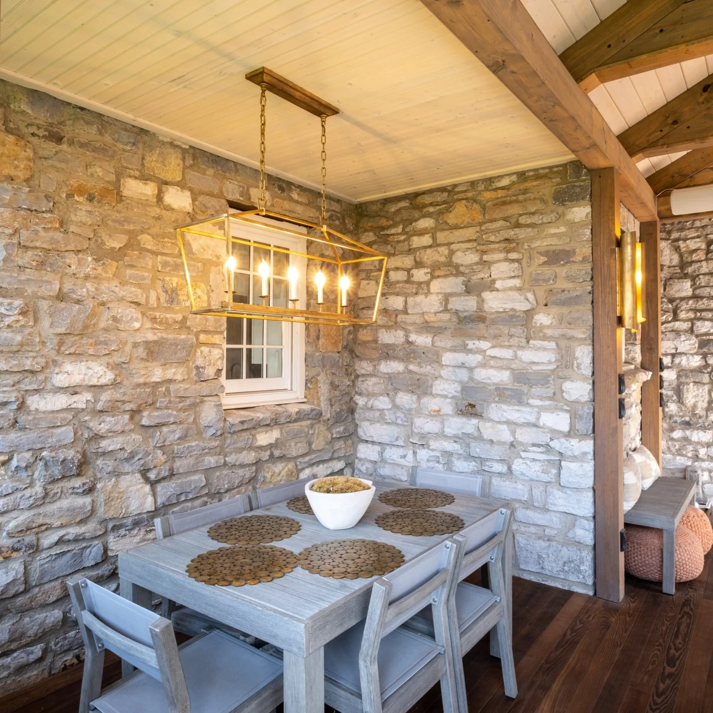 Using the existing stone fireplace and adjacent stone walls as our design inspiration, our Porch Company team created this gorgeous outdoor living room and 6-seater dining area to the delight of this Belle Meade family.
