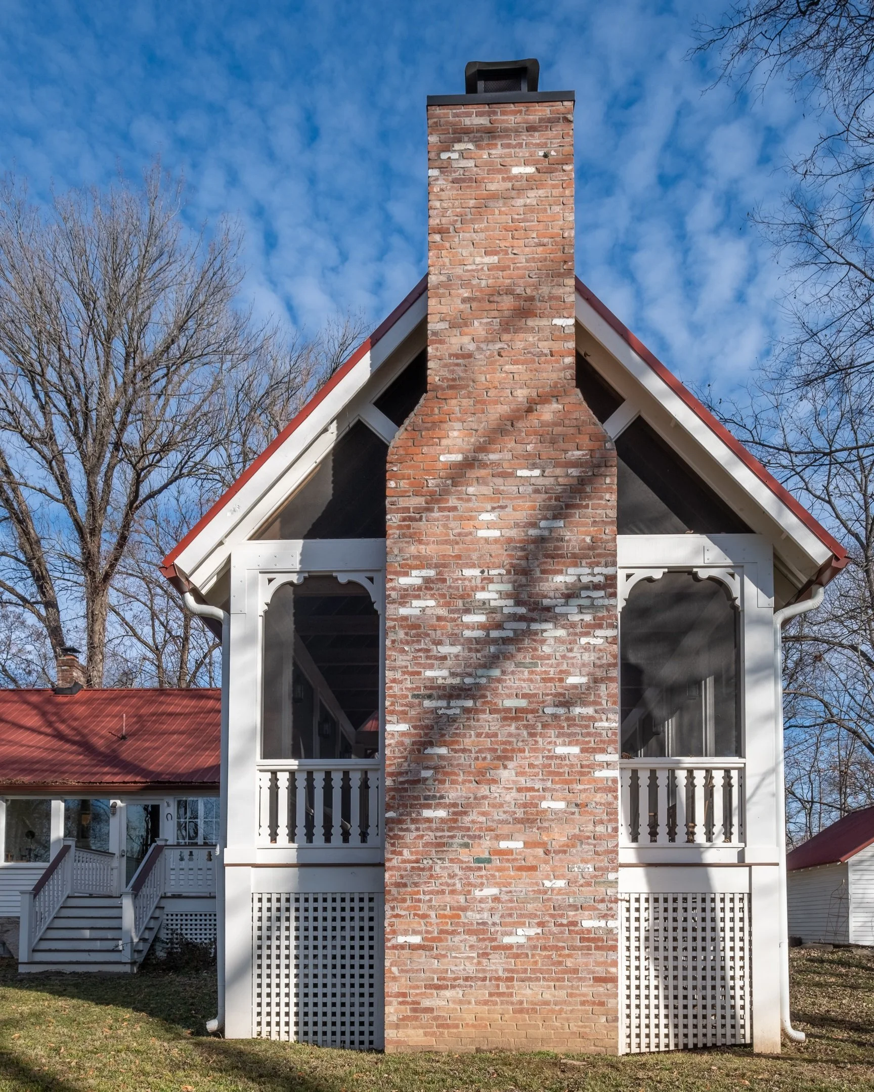 So, first step, take down the existing porch. Step two, remove an existing gas fireplace inside the house which took up space in the old porch structure. In the design process, we created a new fireplace at the very back of the new porch and added a new window in place of the original fireplace.