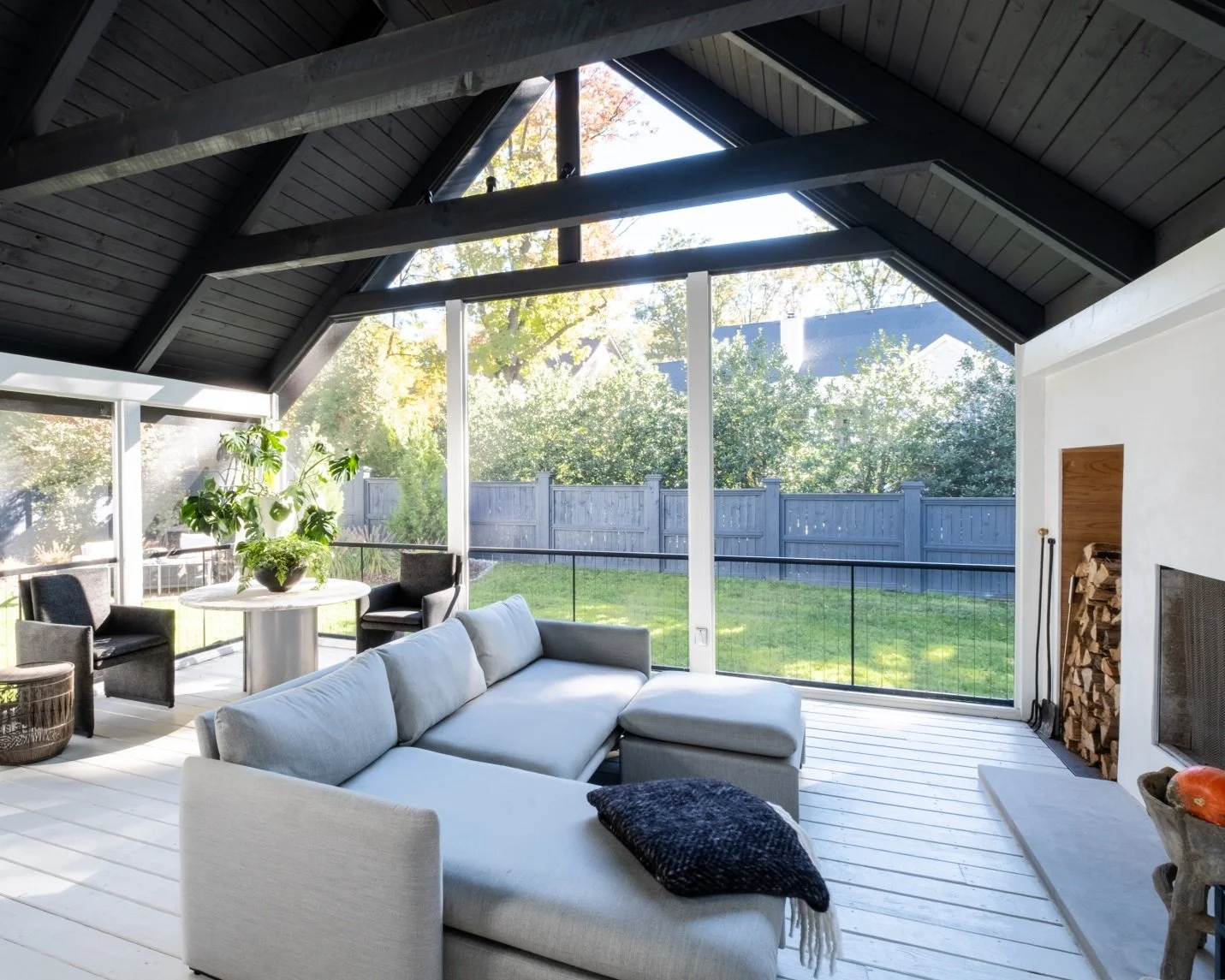 From the overhead construction to the underfoot construction, you’ll notice the natural-looking continuity of wood tones with the Thermory Ash flooring, a favorite for many of our original custom interior porch designs.