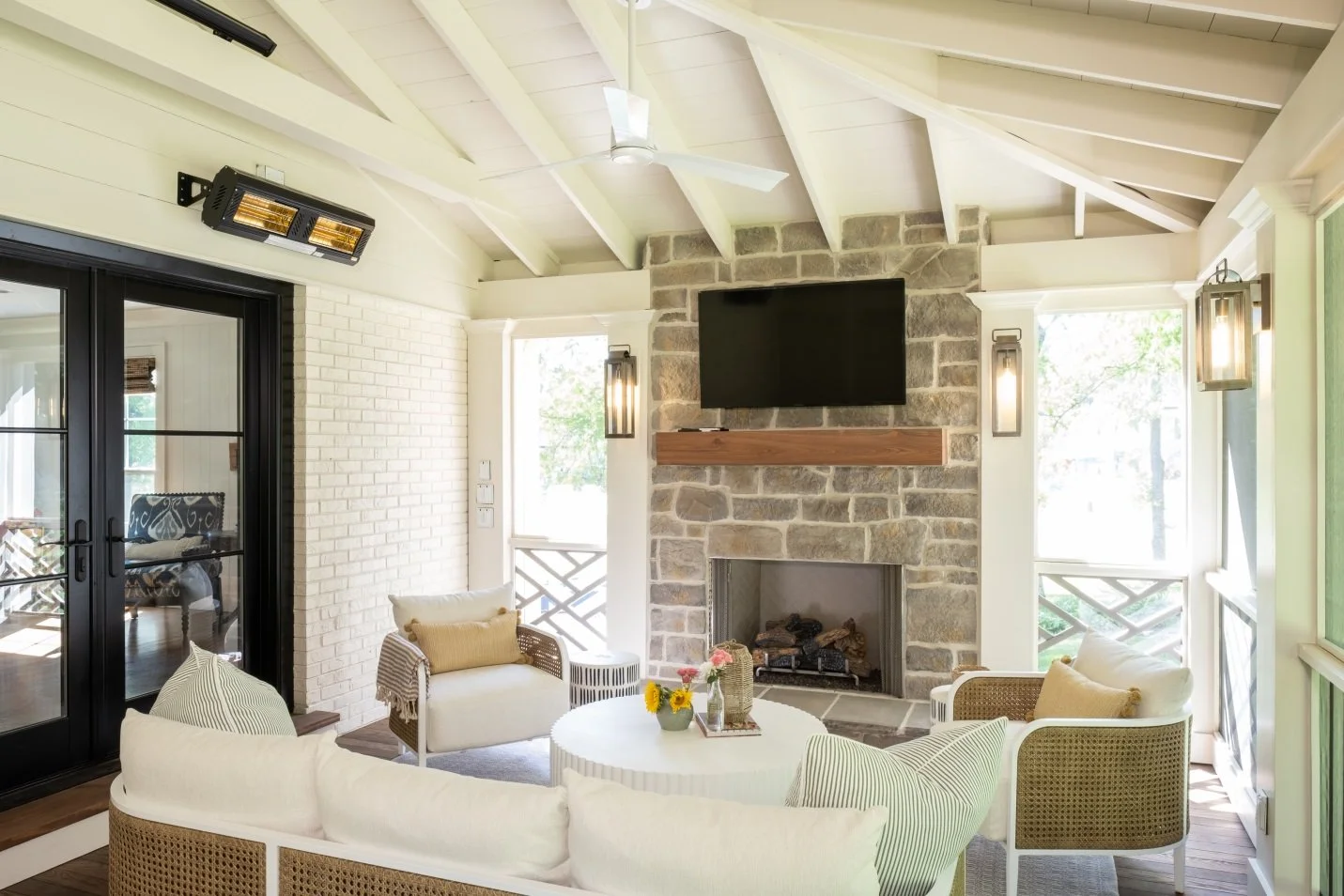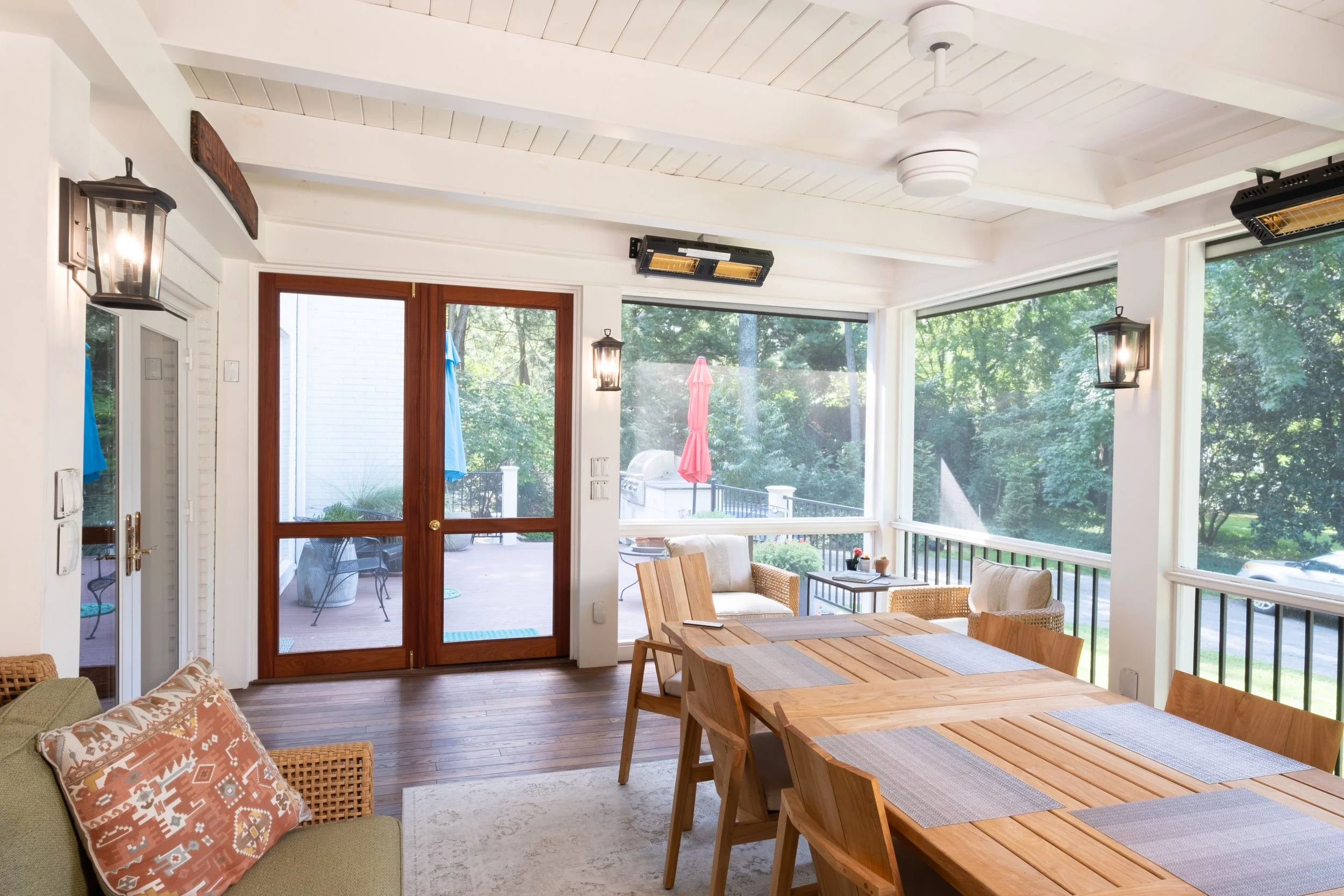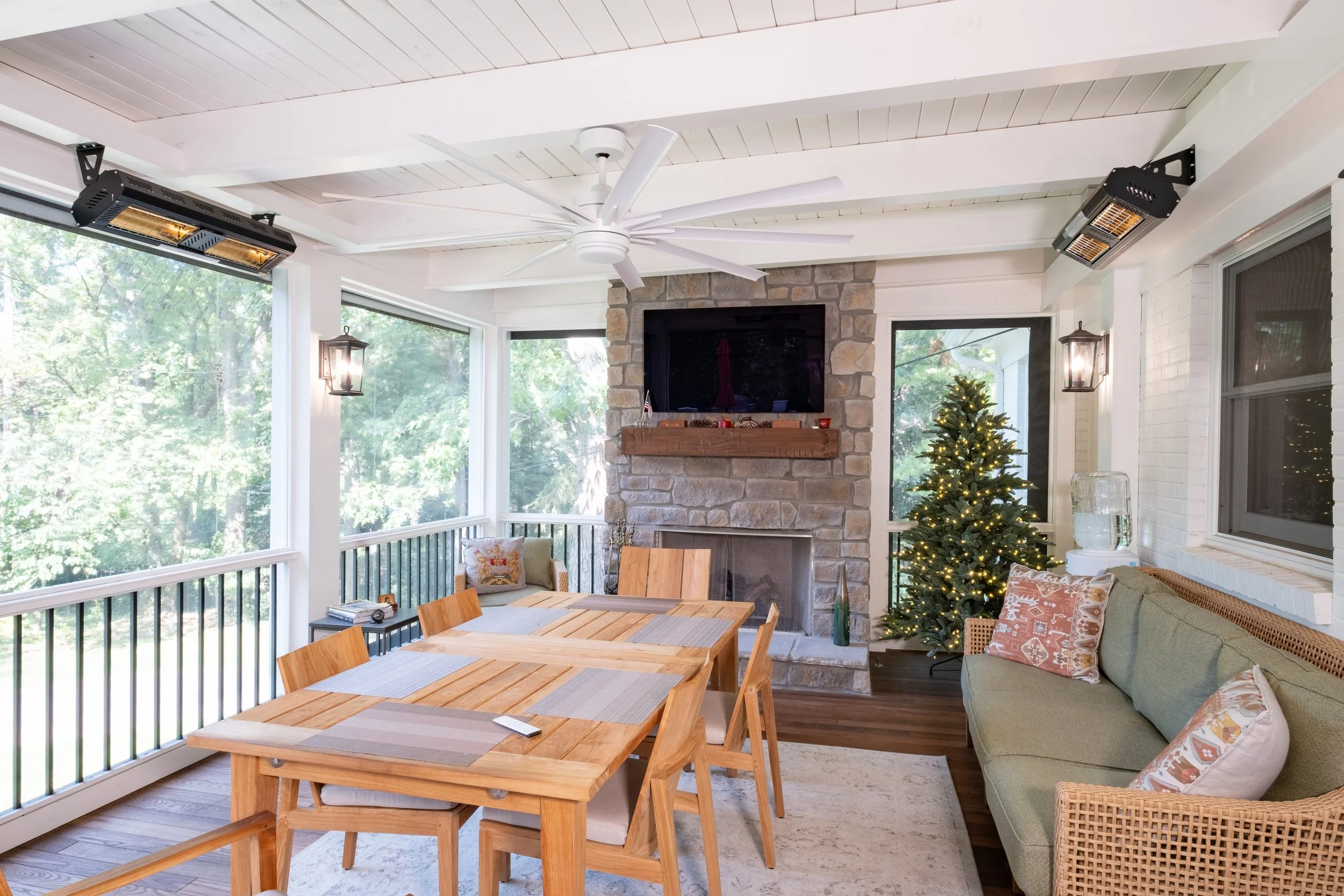To enhance the comfort and functionality of the new porch, we incorporated ceiling height heating elements, ensuring year-round enjoyment even during cooler seasons. An oversized fan provides a gentle breeze on warm days, while carefully placed accent lighting adds ambiance and highlights the architectural features of the porch.