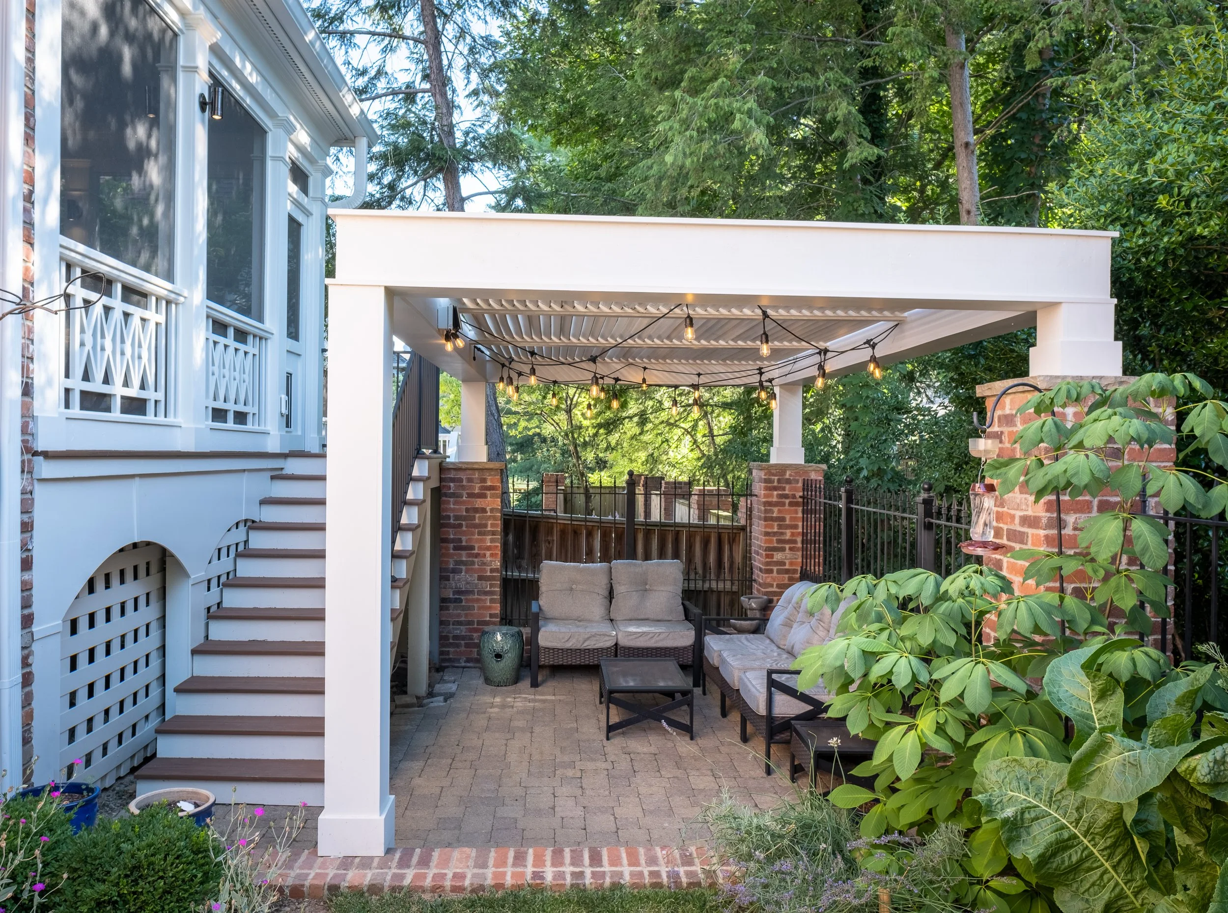 The arbor is a louvered arbor that allows sun and shade into the space, on Mother Nature’s timetable. But design discussions with the homeowners took into account the need for privacy. The arbor is built in such a way that it appears solid when looking from the neighbor's view.