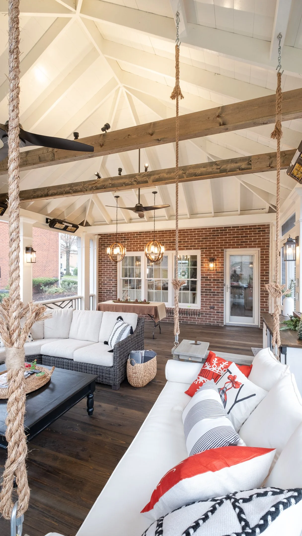 From the overhead construction to the underfoot construction, you’ll notice the natural-looking continuity of wood tones with the Thermory Ash flooring, a favorite for many of our original custom interior porch designs.