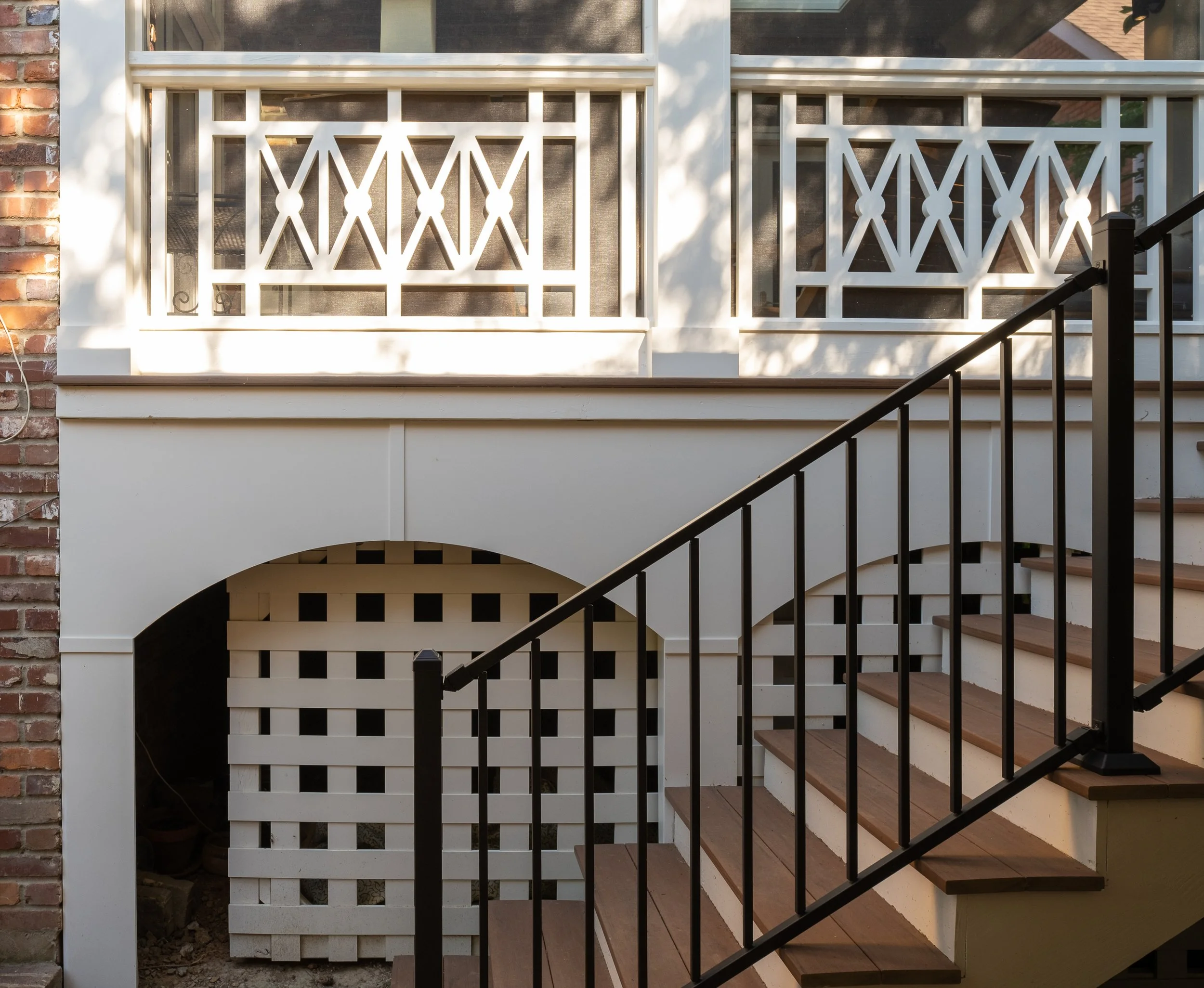 As for the porch surround, it features arches and lattice on the bottom skirting which is all PVC, a composite, non-wood material. For intricate designs that would be difficult to maintain in wood, PVC is our choice for ease of maintenance and a realistic, wood-like aesthetic.