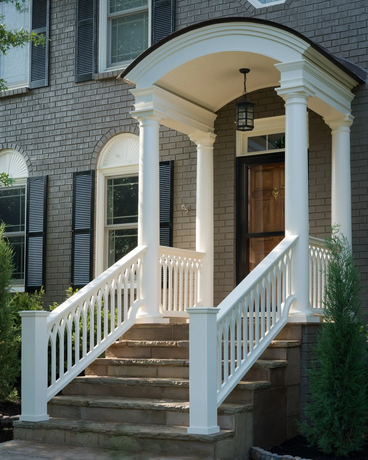 The black spindles of the railings seem to actually ‘disappear’ in the viewer’s line of sight. Fortress railings also allow great air flow, while still meeting requirements of the codes department. The strength of iron adds an extra layer of protection, which is especially important if the porch is elevated or if there are children or pets.